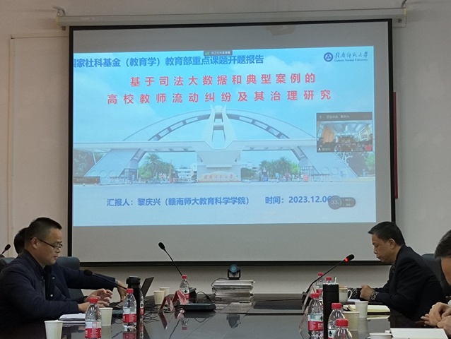 2023年12月6日,教育科学学院黎庆兴博士主持的全国教育科学规划教育部重点课题《基于司法大数据和典型案例的高校教师流动纠纷及其治理研究》开题报告会在三教204举行,开题报告会以线上线下相结合的方式进行。会议由教育科学学院院长邱小健主持,华东师范大学教育学部李政涛教授、辽宁师范大学李德显教授以及赣南师范大学邱小健教授、左志德教授、周先进教授等受邀担任开题专家。学院教师和部分硕士研究生参加了会议。