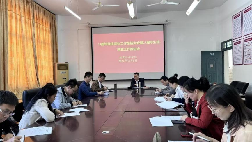 11月8日下午,教育科学学院在第三教学楼204会议室召开2025届毕业生就业工作推进会。学院党政班子、各专业系主任、毕业班班主任、辅导员及就业联络员出席会议。